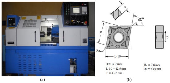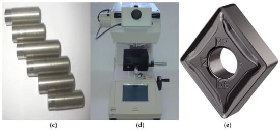 (a) CNC lathe used for experimentation; (b) geometry of the CNMG 120408 MP inserts; (c) Ti6Al4V work pieces; (d) Shimatzu microhardness tester; and (e) CNMG 120408 MP cutting insert.