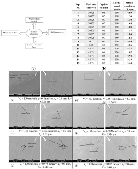 (a) Type of surface alterations observed and (b) process parameters and surface roughness for machining Ti6Al4V. (c–h) Demonstration of surface alterations due to machining of titanium (Ti-6Al-4V) alloy.
