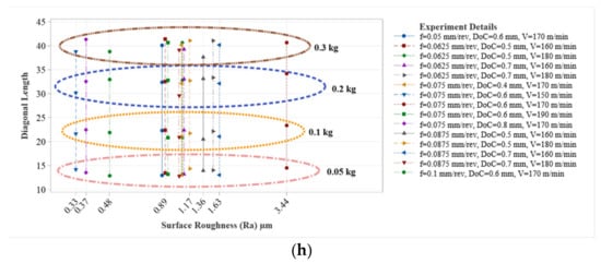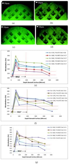 It was observed from the microhardness profiles in Figure 3e–g that the pattern of microhardness variation is almost similar for all the samples until 200 µm depths beneath the surface; later, few variations are seen on the microhardness profiles beyond 200 µm to 500 µm from Figure 3a–d. It was observed from Figure 3e that the microhardness was raised considerably for a 60 µm depth in all the samples. This was then gradually decreased and reached bulk microhardness. As far as the effect of cutting speed is concerned, the microhardness values were higher (390 HV) when machining was carried out at 160 m/min at the lowest feed rate of 0.0625 mm/rev; on the other hand, the machined sample produced at a higher cutting speed of 180 m/min with same feed rate showed relatively lower values of microhardness (367 HV) beneath a 60 µm depth. The microhardness at a 20 µm depth on the cross-section of the machined subsurface was measured for different samples using various indentation loads ranging from 0.05 kg to 0.3 kg, as seen in Figure 3h. A range of indentation loads and distances between indentations were tested, and an optimized indentation distance at a lower load was selected for the Vickers hardness test []. A diagonal length was noted for each microhardness value corresponding to the indentation load for nine replicated samples for the improved accuracy of the microhardness values.