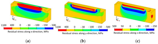 Residual stress distribution for Ti6Al4V along the (a) x, (b) y, and (c) z directions of the two-layer deposit [].