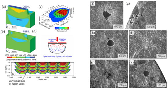 Longitudinal residual stress distribution in (a) DED and (b) SLM. (c) Temperature and velocity distributions during the deposition of the 2nd layer of Ti64. (d) Motion of the molten pool. (e) Transverse-sectional view of the molten pools for three layers and five hatch builds of Ti6Al4 V using 60W laser power 1000 mm/s [,]. (f) Lack of fusion defects in SLM with a stress amplitude of 353 MPa and 1.4 × 107 cycles to failure. (g) Lack of fusion in SLM caused by inadequate consolidation of the powder particles with unmolten particles visible at the defect’s inner surface with a stress amplitude of 342 MPa and 1.56 × 105 cycles to failure. (h) Approximately circular pore created by trapped gas during SLM with a stress amplitude of 342 MPa and 5.59 × 107 cycles to failure. (i) α-phase defect type observed in SLM with a stress amplitude of 560 MPa and 1.17 × 107 cycles to failure. (j) Lack of fusion defects observed in EBM with a stress amplitude of 250 MPa and 2.3 × 108 cycles to failure. (k) Approximate circular pore in EBM with a stress amplitude of 250 MPa and 1.6 × 108 cycles to failure [].