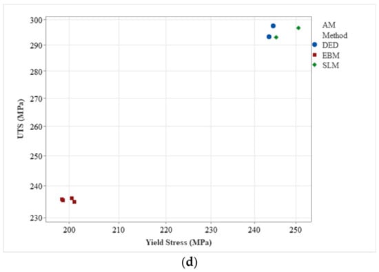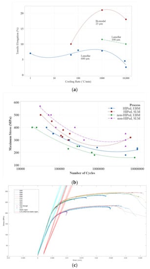 (a) Dependence of tensile elongation on the cooling rate of Ti6Al4V for different grains. (b) Fatigue life of HIPed and non-HIPed SLM and EBM samples without notches (stress concentration factor (Kt) =1). (c) Stress–strain curve for the dog bone coupon manufactured using SLM, DED, and EBM. (d) Comparison of yield stress and UTS for SLM manufactured using SLM, DED, and EBM.