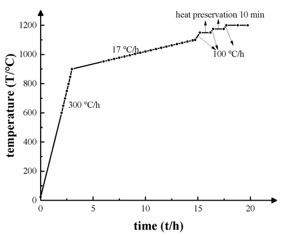 The abnormal growth behavior of Goss grains in a high temperature annealing process was studied by “interruption method” with secondary cold rolled sheet as raw material, and the high temperature annealing specific process (Figure 1) was as follows: in the first stage, the temperature of secondary cold rolled sheet was increased from room temperature to 900 °C at a heating rate of 300 °C/h; in the second stage, the temperature was increased to 1100 °C at a slow heating rate of 17 °C/h; in the third stage, the temperature was increased to 1150 °C, 1175 °C, and 1200 °C at a heating rate of 100 °C/h in turn, and kept for 10 min. At 600 °C–950 °C it was sampled every 50 °C, at 950 °C–1100 °C was sampled every 10 °C, and finally at 1150 °C, 1175 °C, 1200 °C was sampled with 100% N2 during annealed process.