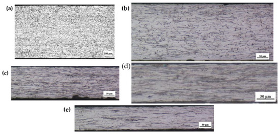 Figure 2 is the metallographic microstructure of the decarburization annealed sheet and secondary cold rolled sheet. The microstructure of the primary cold rolled and decarburized annealed sheet consist of anon-homogeneous distribution of ferrite grains produced by primary recrystallization with an average grain size of 14.0 μm. After secondary cold rolling, the primary recrystallized grains become elongated parallel to the rolling direction and their thickness decreases as the rolling reduction increases. Microstructure of the primary cold rolled and decarburized annealed sheet consists of a non-homogeneous distribution of ferrite grains produced by primary recrystallization. When the reduction rate is 59.2% there are many deformed grains interspersed in the fiber microstructure, and the grain boundaries are obvious (Figure 2b). With the increase in cold rolling reduction rate the deformed grains are elongated and fibered gradually (Figure 2c–e).