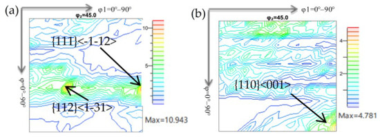 With the increase in the secondary cold rolling reduction rate from 59.2% to 72.8%, the main texture changed from γ orientation {111}<112> to α orientation {112}<110>–{223}<110>. The {111}<112> and Goss texture can form Σ9 grain boundaries, and {111}<112> is easy to be swallowed by Goss grains during secondary recrystallization, so {111}<112> is a favorable texture; however, during high temperature annealing it is difficult for Goss to swallow α orientation grains and thus growth is hindered. The existence of α orientation grains will affect the secondary recrystallization texture and magnetic induction intensity to some extent, so the more {111}<112> component and the less α-texture in the secondary cold rolled sheet, the more favorable they are for secondary recrystallization [10,11]. Therefore, a suitable secondary cold rolling reduction rate can produce enough {111}<112> components and control the α component at the same time. In this study, when the secondary cold rolling reduction rate was 59.2%, α orientation density was the lowest, γ orientation density was the highest, and the highest content {111}<112> was obtained.
