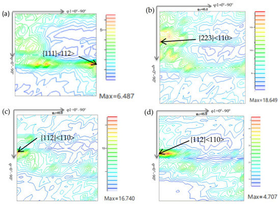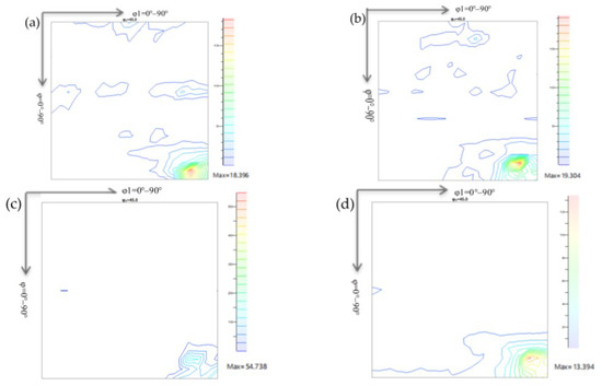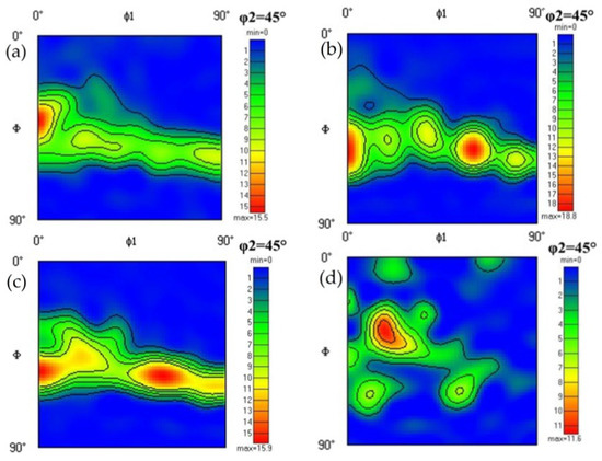 Macro-texture at φ2 = 45° section of the secondary cold rolled sheet: (a) 59.2%; (b) 65.6%; (c) 70.4%; (d) 72.8%.