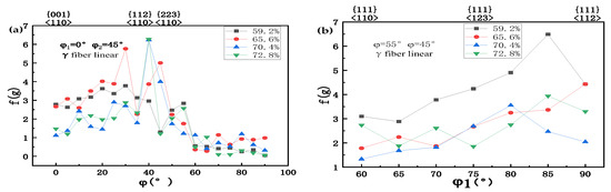 Figure 4 is the macro-texture of the secondary cold rolled sheet. When the secondary cold rolling reduction rate is 59.2%, the texture of the secondary cold rolled sheet is concentrated in {111}<112> (Figure 4a); when the secondary cold rolling reduction rate is 65.6%, the strong point texture rotates to {113}<110> (Figure 4b); when the secondary cold rolling reduction rate increases to 70.4%, the texture is concentrated in {112}<110> (Figure 4c); when the secondary cold rolling reduction rate increases to 72.8%, {112}<110> is still the strong point texture (Figure 4d), but the maximum orientation density is only 1/4 of the maximum orientation density after 65.6% and 74.4% cold rolling reduction rate. Figure 5 shows the orientation lines of the secondary cold rolled sheet. The α orientation line is concentrated in {112}–{223}<110> and the γ orientation line is concentrated in {111}<112>; when the reduction rate is 59.2%, the α orientation density is the lowest (Figure 5a) and the γ orientation density is higher than other reduction rates (Figure 5b). Table 3 shows the content of {111}<112> and {112}<110> texture under different reduction rates; with the increase in reduction rate the content of {111}<112> texture decrease gradually, and when the reduction rate is 59.2% the content of {111}<112> is the highest, which is 27.6%, and the content of {112}<110> is only 0.9%.