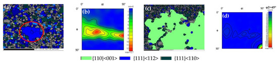 In order to further study the starting temperature of secondary recrystallization of the samples under different secondary cold rolling reduction rates, the abnormal growth of micro-grains was recorded. When the secondary cold rolling reduction rate is 59.2%, there is no abnormal growth of macro-grains at 1050 °C, and further microstructure observation reveals that grains with an average grain size of 255.25 μm are significantly larger than the surrounding grains, which are detected as {111}<112> texture (Figure 6a,b). At 1060 °C, which is detected as Goss orientation (Figure 6c,d), it is concluded that the starting temperature of secondary recrystallization at 59.2% reduction rate is 1050 °C < T < 1060 °C.