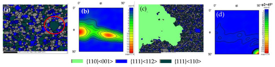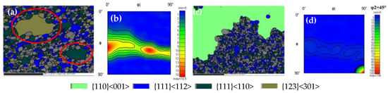 Orientation and microtexture of samples with reduction rate of 65.6%: (a) 1050 °C orientation map; (b) 1050 °C ODF; (c) 1060 °C orientation map; (d) 1060 °C ODF.
