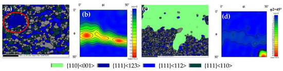 Orientation and microtexture of samples with reduction rate of 72.8%: (a) 1090 °C orientation map; (b) 1090 °C ODF; (c) 1100 °C orientation map; (d) 1100 °C ODF.