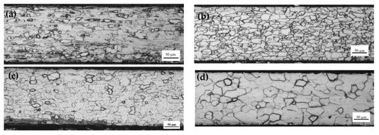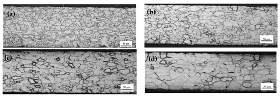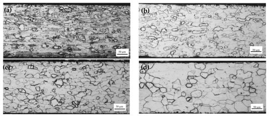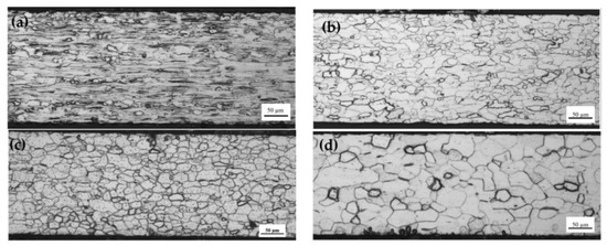 Due to the different rolling forces the microstructure of secondary cold rolled sheet with different reduction rates has obvious differences. As the reduction rate increased from 59.2% to 72.8%, the grain boundaries of the deformed grains gradually blurred and the fiber strip gradually elongated along the rolling direction (Figure 2), which was the same results as in the literature [16].