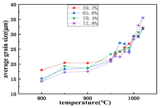 The grain growth evolution during annealing between 800 °C and 1020 °C is shown in Figure 14. Figure 15 is the average grain size at 850 °C and 1020 °C. It can be seen that the grain size of the matrix at the four secondary cold rolling reduction rates increases with the increase in temperature. When the temperature increased from 800 °C to 970 °C, the grain growth rate is slow because the inhibitor has sufficient power to restrict grain growth by pinning grain boundaries and hindered grain boundary, inhibiting the normal growth of the grain. When the temperature increased from 980 °C to 1020 °C, the grain growth rate increases because the coarsening rate of the inhibitor particles increases, and the inhibition ability by the increased temperature in the driving force grain growth increases, so the grain growth rate increased significantly at this stage.