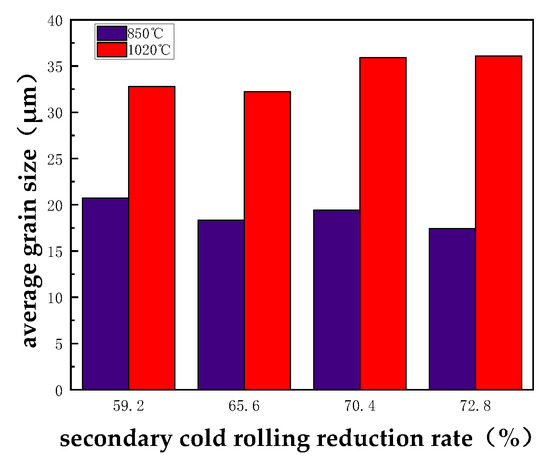 Trend of microstructure and grainsize of samples with different secondary cold rolling reduction rates.