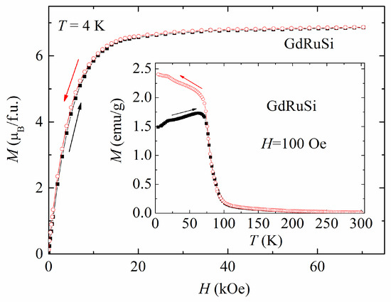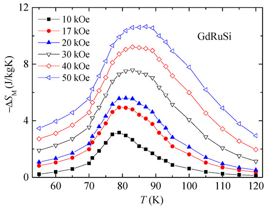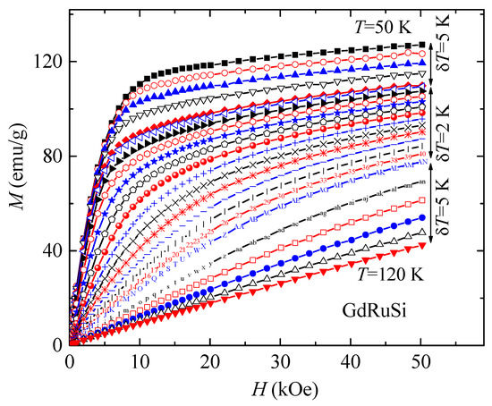 Magnetization isotherms M(H) of GdRuSi in the range T = 50–120 K are shown in Figure 5. The temperature step is 5 K in the ranges 50–70, 95–120 K and 2 K in the range 71–95 K.