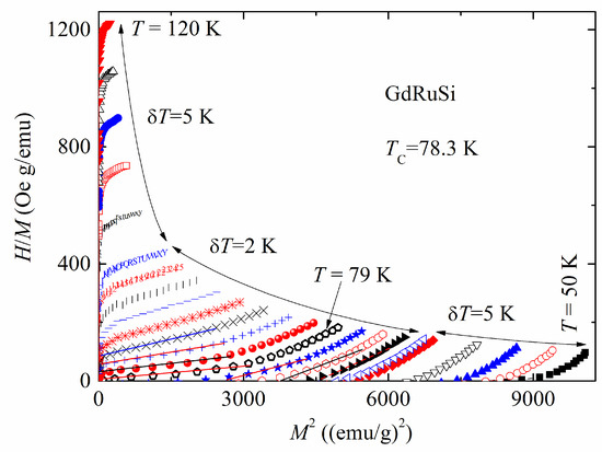 The TC = 78.3 K for GdRuSi was also determined with the help of Arrott plots [28] as is shown in Figure 3. The positive slope of the Arrott curves indicate that the ferromagnet-to-paramagnet transition can be classified as second-order type-phase transition according to the Banerjee criterion [28]. A similar conclusion follows from the absence of thermal hysteresis on the M(T) dependence for GdRuSi in the region of the temperature of the ferromagnet-to-paramagnet phase transition (Figure 2) and from the “caret” shape of the temperature dependence of the change in magnetic entropy –ΔSM(T) (see Section 3.1), which is typical of the second-order magnetic-phase transition [28].