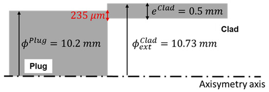 Configurations with chamfers have been already studied [14,23,25]; however, this new configuration has not been investigated experimentally yet. The particularity of this configuration lies in the fact that the clad–plug contact with the chamfer is located under the clad electrode (as for the configuration studied presented in Figure 8). Moreover, the absence of an external bead compared to the configurations studied in the literature would avoid the post-weld machining of assemblies, which is difficult to realize in particular with stacked fuel cladding. An experimental optimization study of this geometry, by taking into account the characteristics of the chamfer, would be required. Preliminary welding experiments with the proposed geometry in order to confirm the numerical simulation results will be carried out.