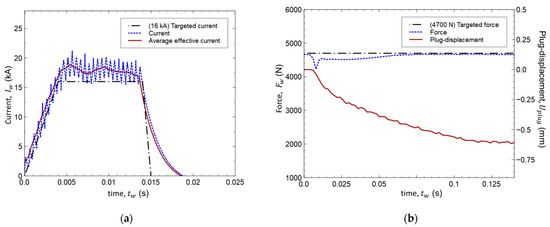 Example of experimental measurements obtained during the PRW process. (a) Applied current, , compared with the targeted electric current, 16 kA. (b) Plug-displacement, , and welding force, , compared to the targeted force, 4700 N.