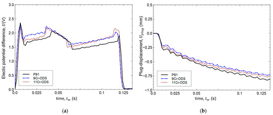 Characteristic experimental measurements obtained for the P91, 9Cr-ODS and 11Cr-ODS steels, using the same set of process parameters (, , ) = (4700 N, 13 kA,120 ms): (a) electric potential difference measured between the jaws, and (b) plug-displacement, .