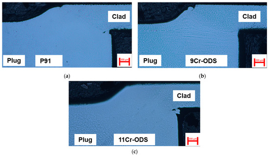 Weld optical metallography images obtained with the same set of process parameters (, , ) = (4700 N, 13 kA, 120 ms) for the three steels: (a) P91, (b) 9Cr-ODS and (c) 11Cr-ODS.
