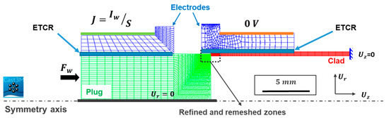 The PRW welding process was modeled considering a 2D axisymmetric geometry, representative of the clad, plug and electrode dimensions (Figure 8). The same mesh was used for the electrical, thermal and mechanical calculations, containing 15,305 quadrangle linear finite elements (QUA4 in the Cast3M library). The mesh close to the contact surface between the plug and the clad, where high thermal gradients and high strains are expected, was refined. Automatic remeshing was applied only in this zone.
