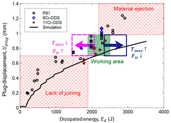 The experimental approach to optimizing the process parameters for the new welding configuration was conducted by defining a working zone and ensuring the absence of defects in welds. It can be defined by correlating the plug-displacement, , with the applied dissipated energy, , regrouping the effect of both and parameters (Equation (1)) [14,20]. These experiments were mainly performed using P91 steel, but tests were also carried out with 9Cr-ODS and 11Cr-ODS steels.