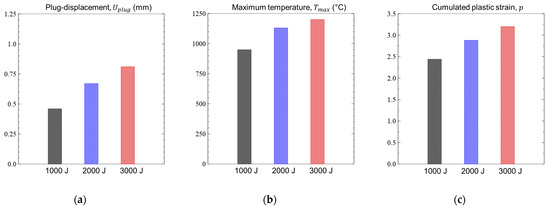 From these numerical simulations, predictions of plug-displacement, maximum temperature and cumulated plastic strain can be compared (Figure 12), allowing for the better understanding of the model response with respect to the applied dissipated energy. By increasing the value of , the heating induced by the Joule effect also increased, and therefore the maximum temperature was reached during the welding process. As the material mechanical strength drastically decreases with the temperature (Appendix B), notably the yield stress and plastic strain increases, and consequently the plug-displacement does as well.