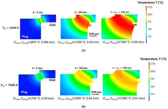 For a welding force of 2600 N, the heat induced by the Joule effect resulted in homogeneous heating at the joint plane; the maximum temperature reached after 5 ms was only 870 °C, while the plug-displacement barely changed. Only when the temperature was sufficiently high did the hottest zones begin to deform, forming inner and outer beads. The maximum temperature reached at 100 ms was 1300 °C, and the final plug-displacement was 0.58 mm. The high temperature attained during the process induced the high deformation of the inner and outer bead and a HAZ width of 1380 (Figure 13a). By comparing these results with those obtained with higher force (7000 N), at 5 ms a clear difference in the plug-displacement was first observed, as one can see on the deformed shapes presented in Figure 13. For a higher welding force, plastic deformation took place once a temperature of about 700 °C was achieved (not presented here). It was necessary to heat the pieces up to 1100 °C to plastically deform them when the welding force was of only 2600 N. By promoting the plastic deformation of both the plug and clad at lower temperatures, the initial contact surface between the clad and plug increased, which in turn decreased the electric current density, as well as the Joule effect and then the temperatures. At 50 ms, the maximum temperature was only 950 °C. At the end of the process, at 100 ms, a difference of −30% in the maximum temperature was obtained between both imposed welding forces, resulting in a HAZ about 35% smaller for the higher force.