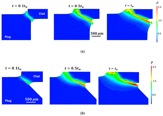 Figure 15 compares the results with the initial geometry on the shape of the joint plane and the cumulated plastic strain field to the results obtained with a modified geometry, presenting a chamfer at 45° on the contact surface between the plug and the clad. The evolution of the plastic strain field with the studied configuration is presented in Figure 15a, while the evolution of the plastic strain field with the modified geometry is shown in Figure 15b. The advantage of this second configuration stands in the localization of the deformation within the external bead of the clad and plug, resulting in a more homogeneous deformation of the external joint (Figure 15b). The angle of the internal joint plane decreased in comparison to the one obtained with the initial configuration (Figure 15). The decrease of this angle could affect the mechanical strength of this zone.