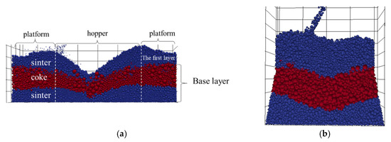 Particle-scale analysis plays a critical role in gaining a deeper understanding of the mechanisms governing the formation of the burden layers and bed structure in the BF throat and shaft. The burden bed at the top of the BF consists of alternating ore and coke layers, and this layered structure tends to persist during the descent in the throat and shaft. Some researchers used the burden surface profile [8,9,10], ore-to-coke ratio [11,12], or porosity distribution [13,14,15] to characterize the burden distribution at the top of the BF. The burden distribution can be indirectly estimated by observing the bed surface by radar [16,17,18,19] or mechanical profile meters [20,21], but the internal structure can only be accessed by extremely time-consuming sampling after filling of the BF before a blow-in; there are no reliable methods by which the internal bed structure can be measured in an operating blast furnace. To save the effort and time of experimental measurements, a large number of mathematical models of the burden distribution have been proposed. These include data-driven methods [22,23] and first principle models [24,25]. Along with the development of software and computing power, numerical simulation methods have become a choice for more researchers. In particular, the discrete element method (DEM) [26] makes it possible to study complex particulate flow problems. The method has already been widely used to study local or global particulate and multiphase flows in the BF under different conditions. The process and development of simulation methods of the ironmaking BF have been summarized in recent reviews [27,28,29].