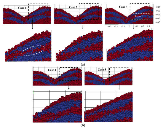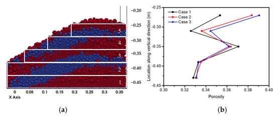 Region 1 in Figure 4 with a size of 0.3 m × 0.1 m × 0.1 m was chosen to further clarify the effects of the static friction coefficient on the radial porosity distribution of the burden layers. Since the blast furnace is charged symmetrically, only 1/2 of the burden bed is considered here. This region was selected to include enough of the bed, but not the wall region where the local porosity is affected by the boundary. Figure 5 shows the radial porosity distribution in Region 1 for different static friction coefficients between particles of different types and between the same types of particles. From Figure 5a,b, it is seen that the porosity increases with the increase in the static friction coefficient for X > 0.1 m, which corresponds to a distance of about 1/3 of the radius from the center. However, for X < 0.1 m, the result is opposite. It is worth noting that the porosity changes little when the static friction coefficient increases further (cf. Cases 2 and 3 in Figure 5a). In addition, there is an increasing porosity trend around the center area for Figure 5b compared with Figure 5a because the large coefficient of static friction between the same types of particles and between particles of different types leads to fewer particles gathering here.