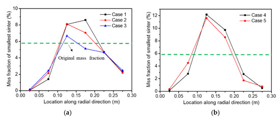 The static friction coefficient influences the ability of particles to move on the burden slope and the permeability of small particles into the voids of large particles. For particles in the intermediate and wall region, the permeability of particles (small sinters) into the voids of large ones has major effects on the porosity. In this region, increasing the static friction coefficient makes it more difficult for small particles to penetrate into the voids of large particles, which results in a large bed porosity. This can be further studied in Figure 6, which shows the mass fraction distribution of the smallest (3 mm) sinter in the mixed region of sinter and coke (i.e., upper half of Region 1). The green dotted lines represent the original mass friction of the smallest sinter in the burden bed. The mass fraction of small sinter decreases with the increase in the static friction coefficient at the intermediate position of the throat, which is the main mixed region. This phenomenon can be seen in Figure 7, where the occurrence of the smallest sinter size (dark blue) shows a decreasing trend from the top to the bottom panel. For particles close to the center position, the particle movability along the burden slope influences the porosity. A large static friction coefficient makes it more difficult for small particles to move to the center position, while some larger ones gather there, resulting in a large bed porosity. However, when the coefficients of static friction between the same types of particles and between particles of different types are all large (Cases 4 and 5), it is difficult for both the large and small particles to move. Therefore, for a BF burden of the platform + hopper profile, which has a slope, increasing the static friction coefficient of sinter–sinter, coke–coke, or sinter-coke will increase the porosity close to the “platform” region (the wall position of the throat) and decrease the porosity close to the “hopper” region.