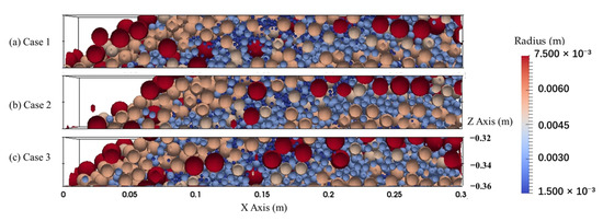 The static friction coefficient of particles includes the coefficient between the same types of particles and between particles of different types. In the BF, the ore (sinter or pellet) and coke are alternately charged layer by layer, so the effects of the static friction coefficient of sinter–coke, sinter–sinter, and coke–coke were studied in this work, as outlined in Table 3. Figure 4 shows a vertical cross section of the burden for different static friction coefficients. With the increase in the static friction coefficient between sinter and coke, sinter and sinter, coke and coke, more particles stay at the platform rather than moving down the funnel to the center, while for small friction coefficients, more particles gather in the funnel. From the enlarged figures in Figure 4, it can be seen that for a mixed region where the sinter is above the coke, the smaller sinter particles penetrate into the voids between the larger coke particles and then gather at the intermediate position if the static friction coefficient is small (cf. region enclosed by the white dotted ellipse). In addition, for the coke, a higher surface roughness (large static friction coefficient) makes it easier for the particles to accumulate near the furnace wall. In the BF, this leads to a “wall-working” gas distribution, which increases heat losses and wall wear, possibly affecting the campaign life length of the BF.