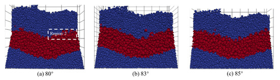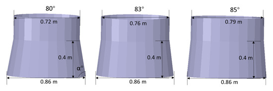 When the burden that has been charged into the BF throat descends into the furnace shaft, it will also move radially due to the increase of diameter. In this process, the shaft angle is an important factor influencing the burden distribution. Figure 9 shows the size of models of the BF top with different shaft angles (α = 80°, 83°, and 85°), which were used to study the effects of shaft angle on the burden and porosity distributions of the bed. Since the furnace height was kept constant, an increasing shaft angle means that the diameter of the throat also increases, as indicated in the figure.