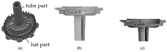 Main parts of the casting (a); geometric difference of the Statorbuchse GD 150 casting: (b) SB 120; (c) SB 55.