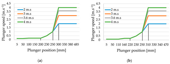 Experimental castings were used as EC electromotors’ housing produced by Rosenberg ltd., Medzev, Slovakia. It consisted of two main parts: the tube part and thin-walled hat part (Figure 1a). The compared shapes of the Statorbuchse GD 150 casting varied in the length of the tube part, and the difference is shown in Figure 1. They will hereafter be referred to as SB 120 and SB 55 based on the designation of the tube’s individual parts. The casting process of both castings was simulated in four alternatives in which the maximum pressing speed of the plunger in the filling chamber—the fast-shot speed vmax—parameter varied. Figure 2 graphically represents the dependence of the plunger speed to its position for both geometric variants.