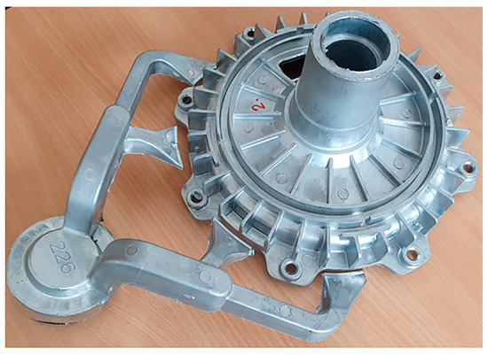 After the numerical simulation, a physical casting process took place, following identical parameters as were used in the simulation. Melting was performed using a Striko Westofen MHS 750/350 furnace, and the melt was degassed for 120 s afterwards. The casting process was performed in CLH 630.02P and CLH 400.02P horizontal cold chamber die casting presses. Two different presses were used due to the considerable dimensional difference of the parts and to secure the undisturbed and continuous production process in the foundry. Process parameters for both castings are provided in Table 2. The SB 55 casting with its gating system is shown in Figure 3.