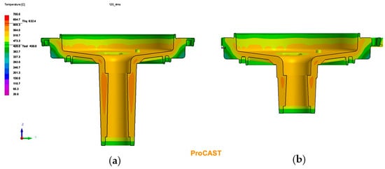 Hot spots were predicted in the bulkier area of the tube element for both geometric alternatives. Figure 5 shows the result of the melt solidification simulation at the filling time of 13.43 s. With the longer tube part, the hot spots for the SB 120 variant were more extensive, thus a higher risk of shrinkage was presented. The thin ribs of the castings were cooled rapidly, which is represented by the blue color.