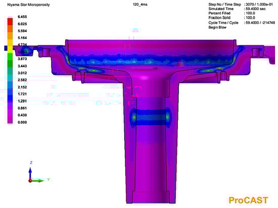 The results of the microporosity simulation correspond with the result of the temperature simulation (Figure 6). In the thickest section of the tube part, the highest presence of microporosity was predicted. Similarly, microporosity was predicted in the thicker section of the hat part.