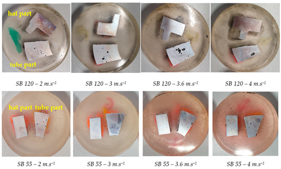 The SB 55 casting specimens did not show an increase in defect size with increasing vmax. On the contrary, their size decreased, as well as their quantity. The exception is the specimen with vmax = 3 m.s−1, which appeared to be almost defect-free.