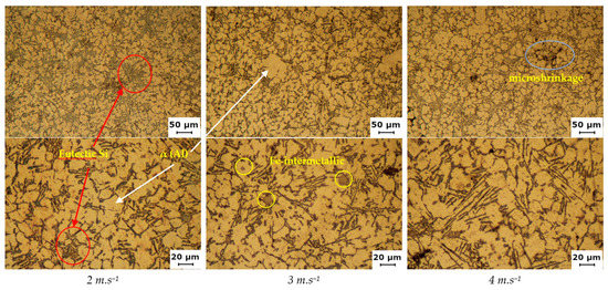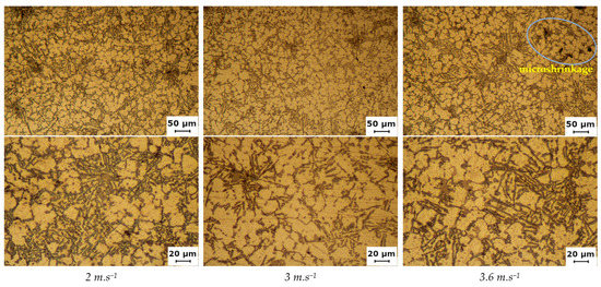 With the change of the maximum plunger velocity vmax, a change in the size of the eutectic Si and α-phase dendrites could be observed for the SB 120 casting’s tube. The eutectic Si had an unmodified morphology in the form of hexagonal lamellae, which appeared as dark needles (Figure 9). At the lowest vmax = 2 m.s−1, clusters of shorter, fragmented needles could be noticed. With increasing velocity, the needles became longer and thinner, and the clusters were not prominent.
