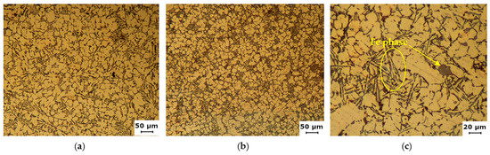 Hat part microstructure: (a) SB 120—2 m.s−1; (b) SB 55—2 m.s−1. (c) Plates and polyhedrons of Fe phase.