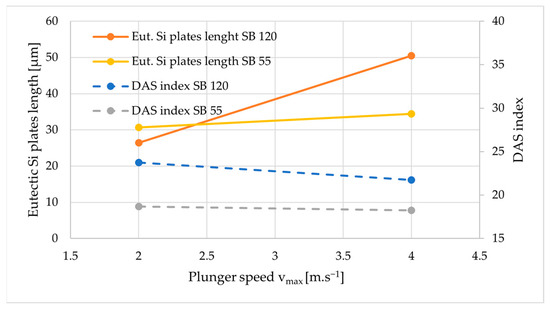 The metallographic observation of the casting proved there was a change in the size of the eutectic silicon and α(Al) phase dendrites with a change of vmax. The lower velocity vmax = 2 m.s−1 and hence lower cavity-filling velocity allowed the hexagonal Si crystal growth mechanism to extend in thickness rather than at plunger velocities vmax 3.6 to 4 m.s−1, where the crystal growth mechanism was observed to subtly dominate in the lengthening of the lamellae. The fact that higher velocities led to the growth of elongated and thinner Si needles meant that the larger slabs did not allow the replenishment of the liquid component into the inter-phase spaces, thus producing micro shrinkage. This trend was common for both casting geometries, but the change in Si needle length and DAS index was less prominent for the SB 55 castings, which was also confirmed quantitatively.