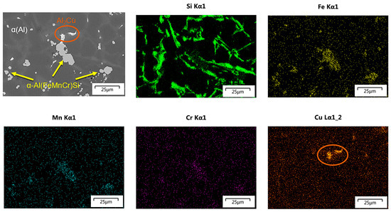 Fabrizi [26], in his experiment, investigated AlSi9Cu3(Fe) alloy and found the formation of compact polyhedral grains of α-Al(Fe,Mn,Cr)Si phase in the form of a rhombic dodecahedron. Considering the chemical analysis of the experimental alloy confirming the small mass fraction of Mn and Cr, it can be theorized that the presented experiment also contains a phase of this kind. The EDS analysis for the presence of the mentioned elements (Si, Mn, Cr, Fe and Cu) was performed on selected samples (Figure 13). The presence of the Fe, Cr and Mn was confirmed at the polyhedral phase in the center of the image, as well as in the minor phases. Thus, small polyhedral inter-metallic phases as small as 2 µm in size occurring also in the optical microscopy images can be considered as α-Al(Fe,Mn,Cr)Si.