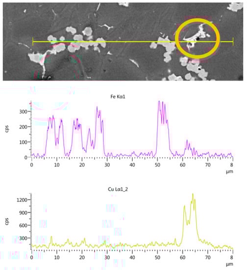 A line of the EDS analysis from another part of the tube part specimen shows the change in chemical composition along the length of the section. From Figure 14, it can be easily determined which phases intersecting the line segment represented the iron-rich and copper-rich phases. The shape of the copper inter-metallic phase Al2Cu was manifested as a compact phase.