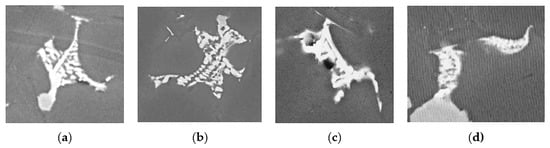 In Figure 15, copper phases from castings with different vmax are shown, and the eutectic character of the phase in the form of numerous spherical particles can be observed most clearly at a velocity of 3.6 m.s−1. However, since both modifications were from the same sample (Figure 15c,d), it cannot be stated that vmax was a parameter that fundamentally influenced the shape of the copper phase modification.