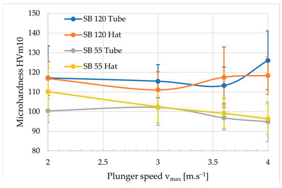 Microhardness dependence on plunger speed vmax.