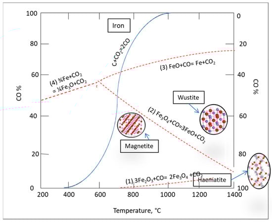 Figure 2 illustrates the interaction of iron oxide with CO and CO2 in different proportions, and reaction 1 in the figure indicates the low concentrations of CO and CO2 required for the reduction reaction [12]. Higher concentrations will lead to an inefficient, incomplete reduction, and as this reaction is irreversible, an incomplete reduction cannot be reverted [23].
