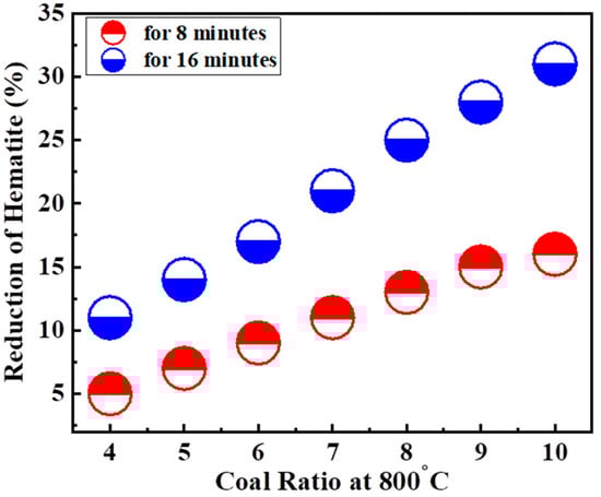 Effect of coal ratio at 800 °C for the reduction of hematite.