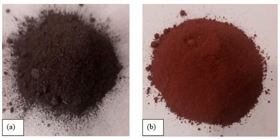 X-ray diffraction was used for the identification of phases in the raw ore and treated samples. Three samples of different compositions were studied in the analysis, as they were influenced by the magnetic field generated by a bar magnet. A color change during reduction roasting was also observed, from reddish hematite to a dark gray reduction product, as shown in Figure 6.