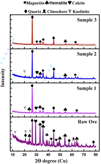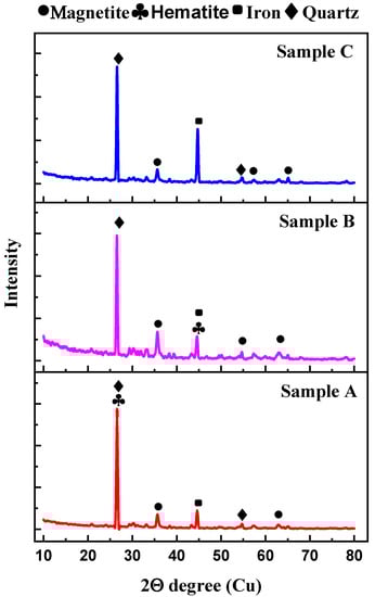 XRD results were obtained after samples A, B, and C were subjected to the drum wet weak magnetic separator at three different current frequencies, i.e., 3 amperes, 4 amperes, and 5 amperes, respectively, as shown in Figure 10. Magnetite was clearly identified in all three samples. Moreover, free alpha iron and quartz were also present.